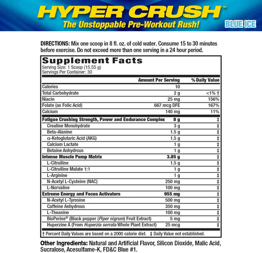Hyper Crush Pre-Workout Powder – Energy, Pumps & Fatigue Support – 3 G Creatine, Citrulline, 350 Mg Caffeine – Blue Ice, 30 Servings
